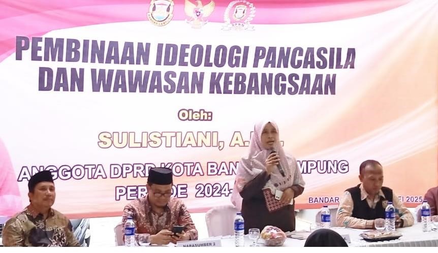 BANDARLAMPUNG — Anggota DPRD Kota Bandarlampung, Sulistiani, menggelar kegiatan Pembinaan Ideologi Pancasila dan Wawasan Kebangsaan di Kelurahan Sumber Rejo Sejahtera, Kamis (8/5/2025).