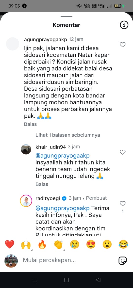 “Ijin pak, jalanan kami di Desa Sidosari Kecamatan Natar kapan diperbaiki? Kondisi jalan rusak baik di dekat balai desa maupun jalan dari Sidosari menuju Dusun Simbaringin. Desa kami berbatasan langsung dengan Kota Bandar Lampung, mohon bantuannya untuk proses perbaikan jalan,” tulis Agung melalui akun @agungprayogaakp.
