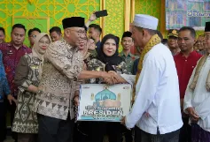 BANDARLAMPUNG — Gubernur Lampung, Rahmat Mirzani Djausal, menyerahkan secara simbolis seekor sapi kurban bantuan kemasyarakatan dari Presiden Republik Indonesia kepada pengurus Masjid Jami Nurussa’adah, Kelurahan Panjang Utara, Kota Bandar Lampung, Kamis (5/6/2025).