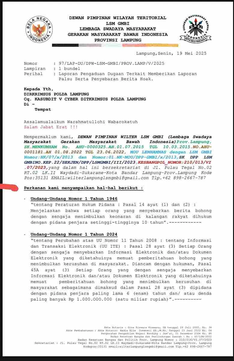 Merespons perkembangan ini, LSM Gerakan Masyarakat Bawah Indonesia (GMBI) Wilayah Teritorial Provinsi Lampung resmi melayangkan laporan pengaduan kepada Direktorat Kriminal Khusus (Ditkrimsus) Polda Lampung, tepatnya Subdit V Cyber Crime.