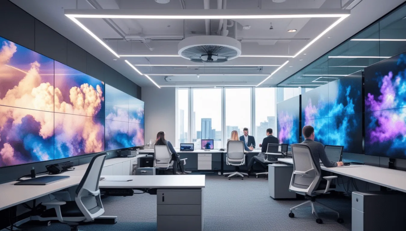 Digital signage dan LED display juga digunakan untuk menyampaikan informasi secara mudah dan cepat, membantu komunikasi internal dan menguatkan branding perusahaan. Kombinasi berbagai media ini memperkaya pengalaman kerja dan membuat ruang kantor lebih fungsional.