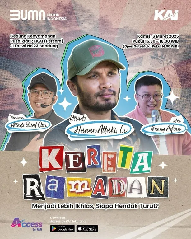 Kereta Ramadan akan berlangsung dari pukul 15.30 hingga 18.00 WIB dengan open gate mulai pukul 14.00 WIB. Acara ini menghadirkan berbagai sesi inspiratif, termasuk tilawah oleh Ustadz Bilal Qori serta tausiyah dari Ustadz Hanan Attaki, Lc., yang akan menyampaikan pesan-pesan kebaikan untuk menyambut Ramadan dengan hati yang lebih ikhlas. Acara ini juga akan dipandu oleh Bunny Asfian sebagai host.