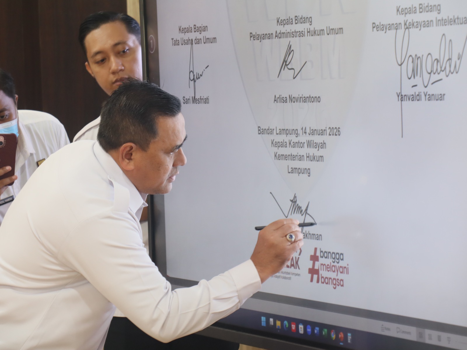 Penandatanganan komitmen dilakukan langsung oleh Kepala Kantor Wilayah Kemenkum Lampung Taufiqurrakhman, bersama Kepala Divisi Pelayanan Hukum Benny Daryono, Kepala Divisi P3H Laila Yunara, Kepala Bagian Tata Usaha dan Umum Sari Mesfriati, Kepala Bidang Pelayanan AHU Arlisa Noviriantono**, serta Kepala Bidang Pelayanan KI Yanvaldi Yanuar, dan disaksikan oleh seluruh pegawai.