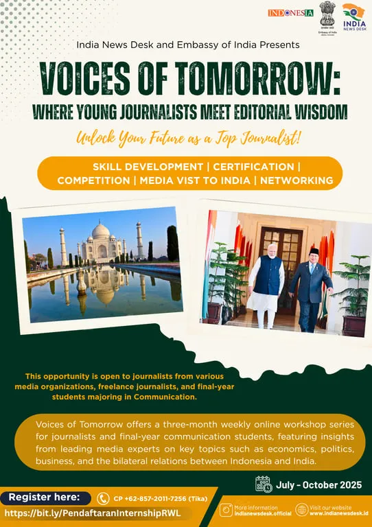Jakarta, 8 Juli 2025 — Dalam upaya memperkuat hubungan bilateral dan kerja sama media antara Indonesia dan India, India News Desk bekerja sama dengan Kedutaan Besar India di Jakarta meluncurkan program unggulan bertajuk “Voices of Tomorrow: Where Young Journalists Meet Editorial Wisdom”. Program ini dirancang khusus untuk membekali jurnalis muda Indonesia dengan wawasan, keterampilan, dan jejaring internasional dalam dunia jurnalistik modern.