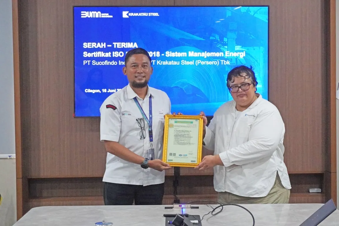 Cilegon (18/06) – PT Krakatau Steel (Persero) Tbk pada Juni 2025 secara resmi memperoleh Sertifikat ISO 50001:2018 dalam hal Manajemen Energi dari PT Sucofindo Indonesia. Prosesi penyerahan sertifikat dilaksanakan di Wisma Krakatau Steel Cilegon dan diserahkan langsung oleh Kepala Cabang Sucofindo Cilegon Iyus D. Purnama, kepada VP of Research & Technology Fathurrahmi Dasril, dan VP of Operation Excellence Tumpal H Simatupang yang mewakili Manajemen Perseroan serta Tim Sistem Manajemen Energi.