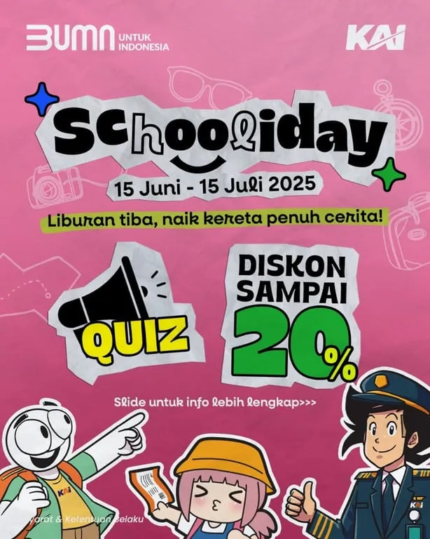 Menyambut masa liburan sekolah, PT Kereta Api Indonesia (Persero) Daerah Operasi 8 Surabaya menghadirkan promo spesial bertajuk “Schooliday: Liburan Tiba, Naik Kereta Penuh Cerita!”. Promo ini memberikan potongan harga tiket hingga 20% untuk perjalanan kereta api jarak jauh selama periode libur sekolah, yaitu mulai 15 Juni hingga 15 Juli 2025.