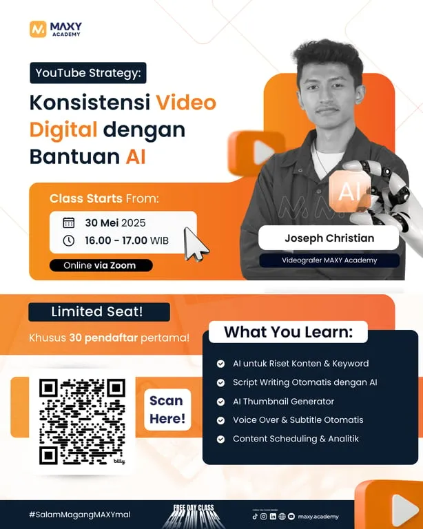 Dipandu oleh Joseph Christian, Videografer Maxy Academy, sesi ini akan membahas berbagai strategi dan tools AI yang bisa dimanfaatkan untuk mengoptimalkan seluruh proses produksi konten YouTube—mulai dari riset ide, pembuatan skrip, editing, desain thumbnail, hingga publikasi dan analisis performa.