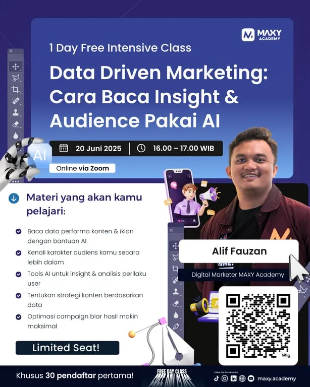 Dipandu oleh Alif Fauzan, Digital Marketer dari MAXY Academy, kelas ini membahas secara mendalam bagaimana memanfaatkan teknologi kecerdasan buatan (AI) untuk membaca insight audiens, mengidentifikasi konten berkinerja tinggi, serta mengoptimalkan strategi kampanye secara lebih akurat dan terarah.