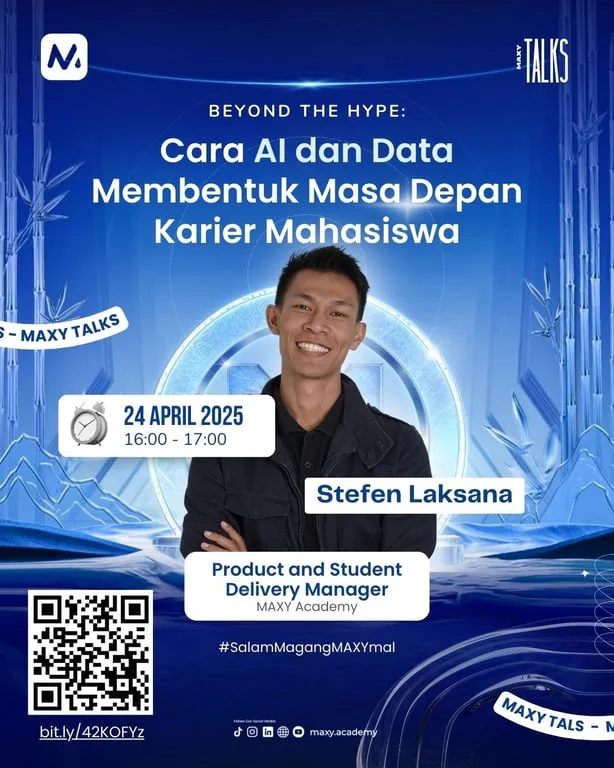Acara ini akan dilaksanakan secara daring pada Kamis, 24 April 2025, pukul 16.00 WIB. Bersama Stefen Laksana, Product and Student Delivery Manager Maxy Academy, peserta akan diajak memahami bagaimana AI dan data kini menjadi bagian tak terpisahkan dari berbagai bidang kerja, serta bagaimana mahasiswa bisa mulai membangun fondasi karier mereka dengan memahami dua hal tersebut sejak dini.