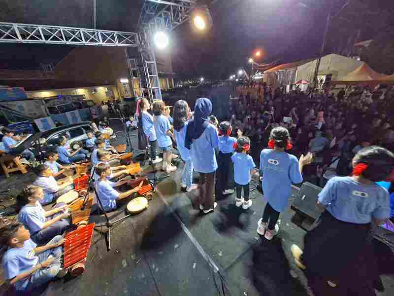 Lantunan suara bening khas anak-anak dan koreografi yang rapi membuat sejumlah pengunjung berhenti sejenak dari keramaian stan kopi dan kuliner.