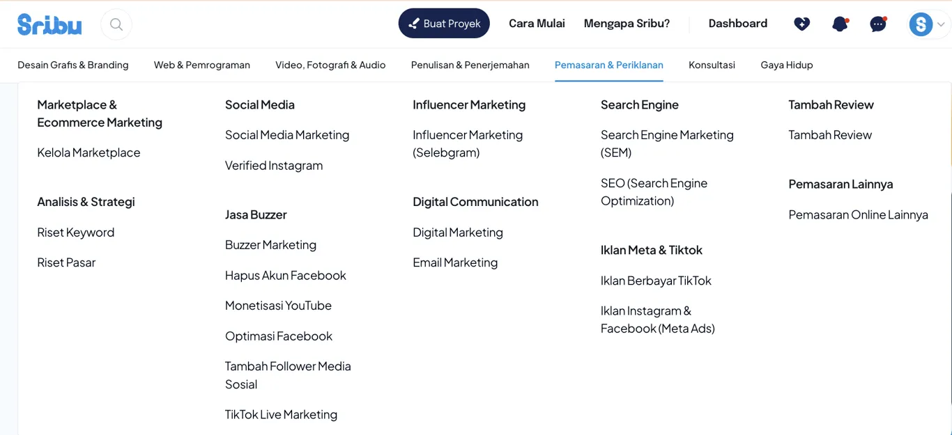 Menariknya, pada kuartal pertama tahun 2025, kategori pemasaran digital resmi menjadi layanan paling banyak dibeli di platform Sribu, menggeser desain grafis yang selama ini mendominasi sejak awal berdirinya Sribu.