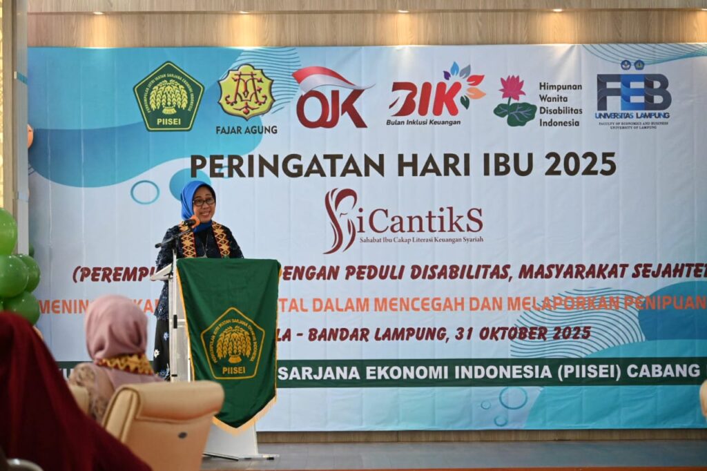 Ketua PIISEI Cabang Lampung Prof. Dr. Marselina Djayasinga, S.E., M.P.M., dalam sambutannya menekankan pentingnya peran perempuan dalam meningkatkan literasi keuangan keluarga serta menjaga keamanan finansial di era digital.