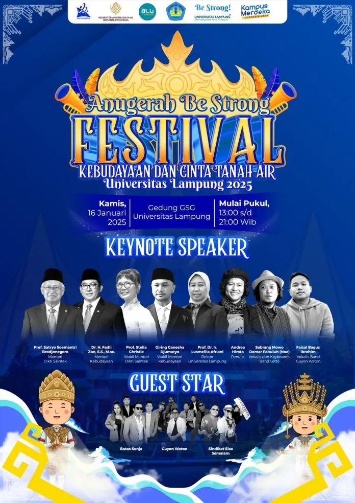 Acara ini akan dihadiri sejumlah tokoh nasional sebagai keynote speaker, termasuk Menteri Pendidikan Tinggi dan Sains Prof. Satryo Soemantri Brodjonegoro, Menteri Kebudayaan Dr. Fadli Zon, S.Si., M.Sc., serta Wakil Menteri masing-masing bidang, Prof. Stella Christie dan Giring Ganesha Djumaryo. Tidak ketinggalan, Rektor Unila, Prof. Dr. Ir. Lusmeilia Afriani, D.E.A., IPM., ASEAN Eng., juga akan berbagi pandangan terkait kontribusi pendidikan tinggi dalam membangun cinta tanah air.