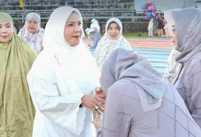 Walikota Bandar Lampung, Hj. Eva Dwiana mengikuti Sholat Idul Fitri bersama Keluarga, para Pejabat Pimpinan Tinggi Pratama Pemerintah Kota Bandar Lampung beserta masyarakat di Lapangan Way Dadi Kota Bandar Lampung, pada Senin (31/03/2025).