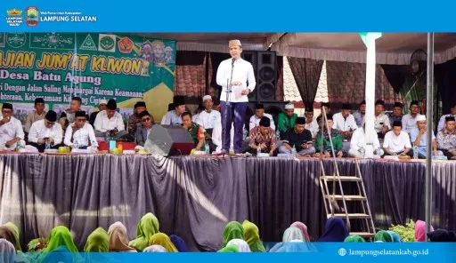 Merbau Mataram – Bupati Lampung Selatan, Radityo Egi Pratama, menghadiri kegiatan Pengajian Jumat Kliwon yang digelar oleh Pengurus Ranting Muslimat Nahdlatul Ulama (NU) Desa Batu Agung, bertempat di TPA Nurul Huda, Dusun Batu Agung, Kecamatan Merbau Mataram, Jumat (1/8/2025).